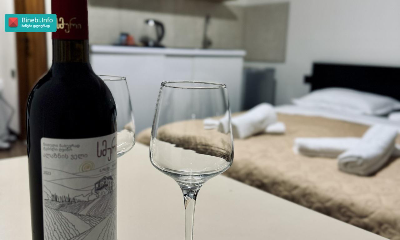 ბინა მდებარეობს გუდაურის ცენტრში, სასტუმრო მარკო პოლოსთან და სუპერმარკეტ სმარტთან, გათვლილია 7 ადამიანზე.